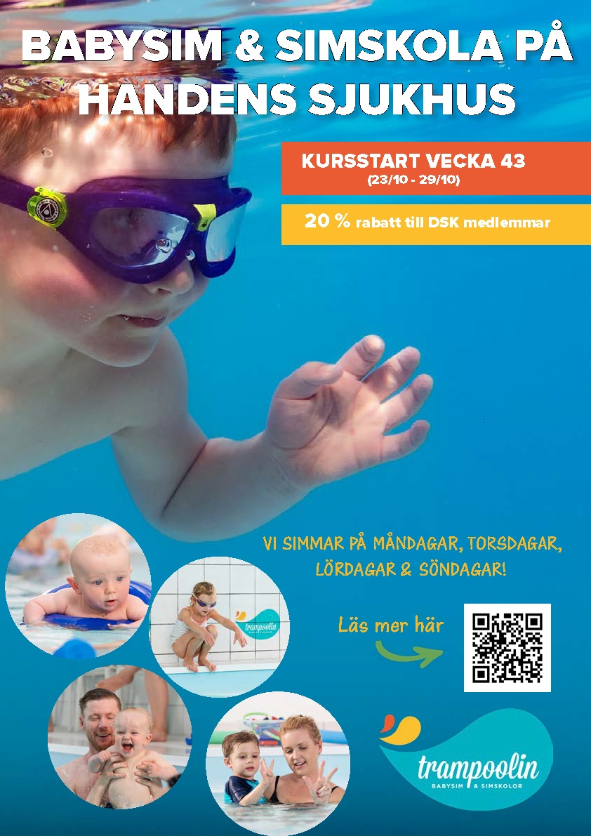 Trampoolin Simskola erbjuder 20% rabatt för medlemmar i Dalarö SK vid bokande av simskola som startar vecka 43 (23/10-29/10)