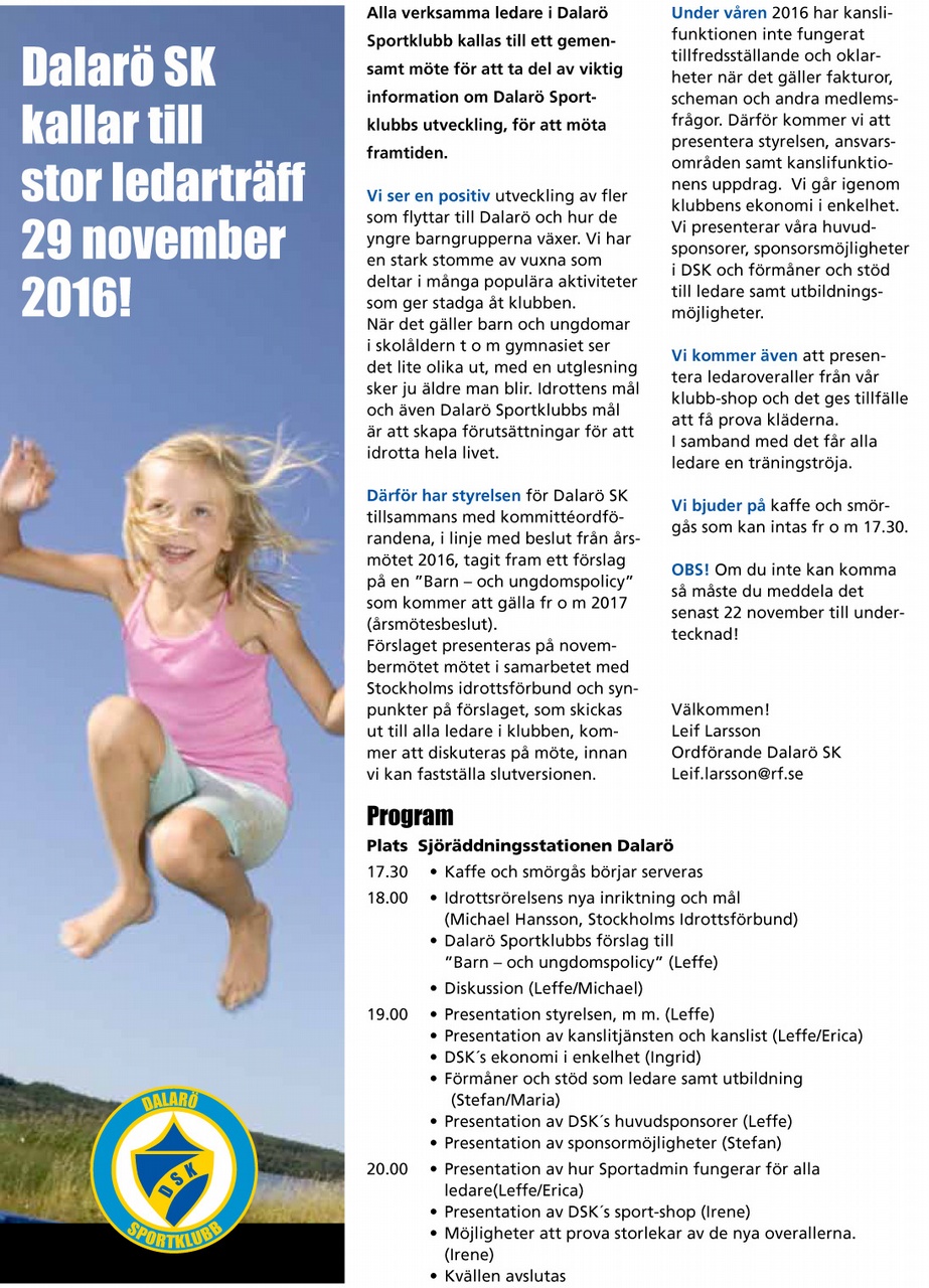 Stor ledarträff för Dalarö Sportklubbs alla ledare 29/11 på